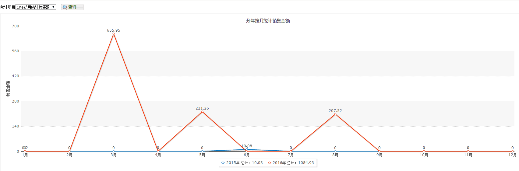 在后台互动管理——》订单管理里的销售统计里可查询销售统计图表,可以按天统计当月销售额,也可分年按月统计销售额,还可查询销售排行榜和销售业绩。