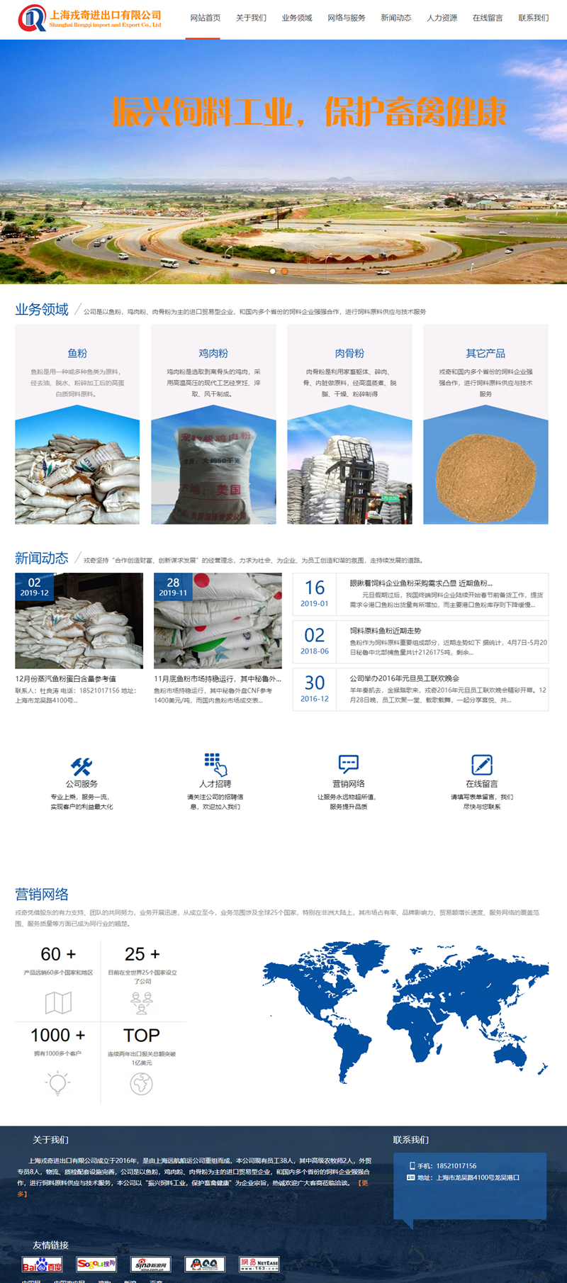 上海戎奇进出口有限公司成立于2016年,是由上海远航船运公司重组而成,本公司现有员工38人,其中高级农牧师2人,外贸专员8人,物流、质检配套设施完善,公司是以鱼粉,鸡肉粉、肉骨粉为主的进口贸易型企业,和国内多个省份的饲料企业强强合作,进行饲料原料供应与技术服务,本公司以“振兴饲料工业,保护畜禽健康”为企业宗旨,热诚欢迎广大客商莅临洽谈。