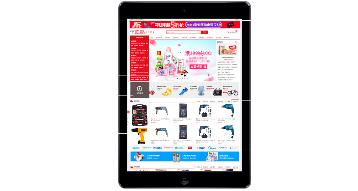 商品多级分类、幻灯片、广告位、电梯楼层、选项卡、图片放大、购物车等页面设计,给你不一样的视觉冲击