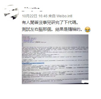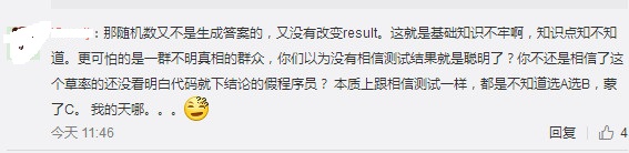 两位的意思其实大致相同,微博的这位程序员所截的图,并不能证明测试结果是随机的,如果想知道真相,必须要知道更全面的代码才能推算出来。